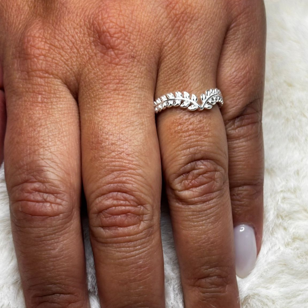 Com 1,6mm de espessura, é substancial, mas confortável. O design em V é perfeito para o *stacking* (empilhamento), permitindo que encaixes um solitário ou anel de compromisso por cima. É a peça ideal para quem busca versatilidade com uma referência subtil à beleza natural.
