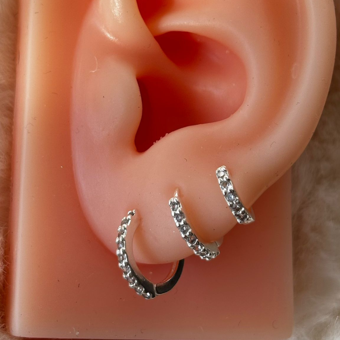 Disponível em três tamanhos distintos (8mm, 11mm e 13mm), é perfeita para se adaptar ao seu estilo: use o tamanho G para um *statement* elegante, ou combine os tamanhos P e M para criar um **degradê de brilho** em múltiplos furos. O **fecho click** garante o conforto e segurança que o uso diário exige.