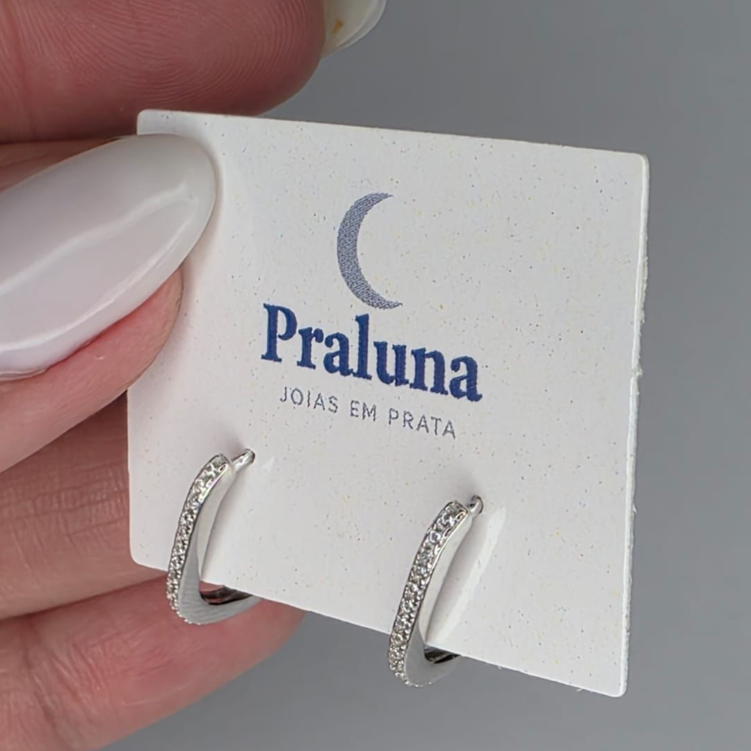 A Argola Encanto Cravejada é o luxo em movimento. O seu design oval e alongado é inteiramente adornado com Zircónias cravadas em Prata 925 legítima, criando um brilho contínuo e deslumbrante que ilumina o rosto.
