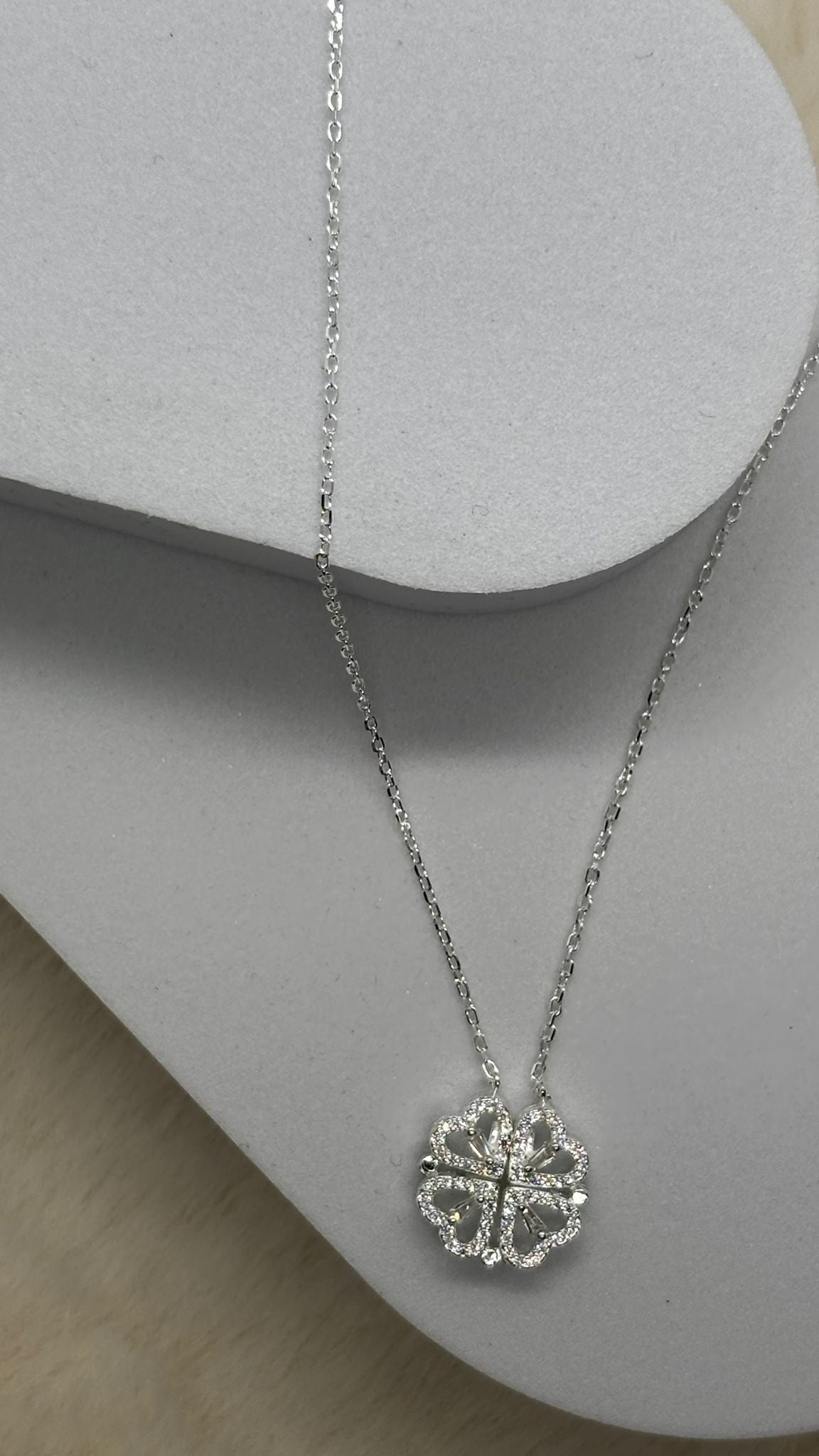 Com 40cm de comprimento, o colar apresenta um delicado conjunto em coração/trevo cravejado vazado, unido por íman, permitindo alternar facilmente entre as duas formas. Finalizado com elo português, é uma joia moderna, prática e cheia de significado — perfeita para iluminar o visual e acompanhar diferentes momentos com charme e personalidade.