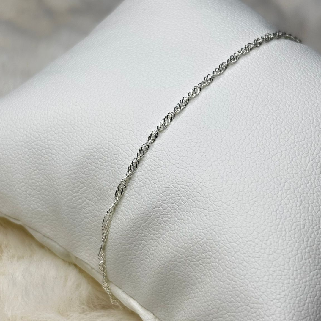 A Pulseira Singapura é uma obra-prima de delicadeza. A sua malha em Prata 925 legítima possui um design torcido único, que capta e reflete a luz de todos os ângulos, criando um efeito cintilante natural mesmo sem pedras.