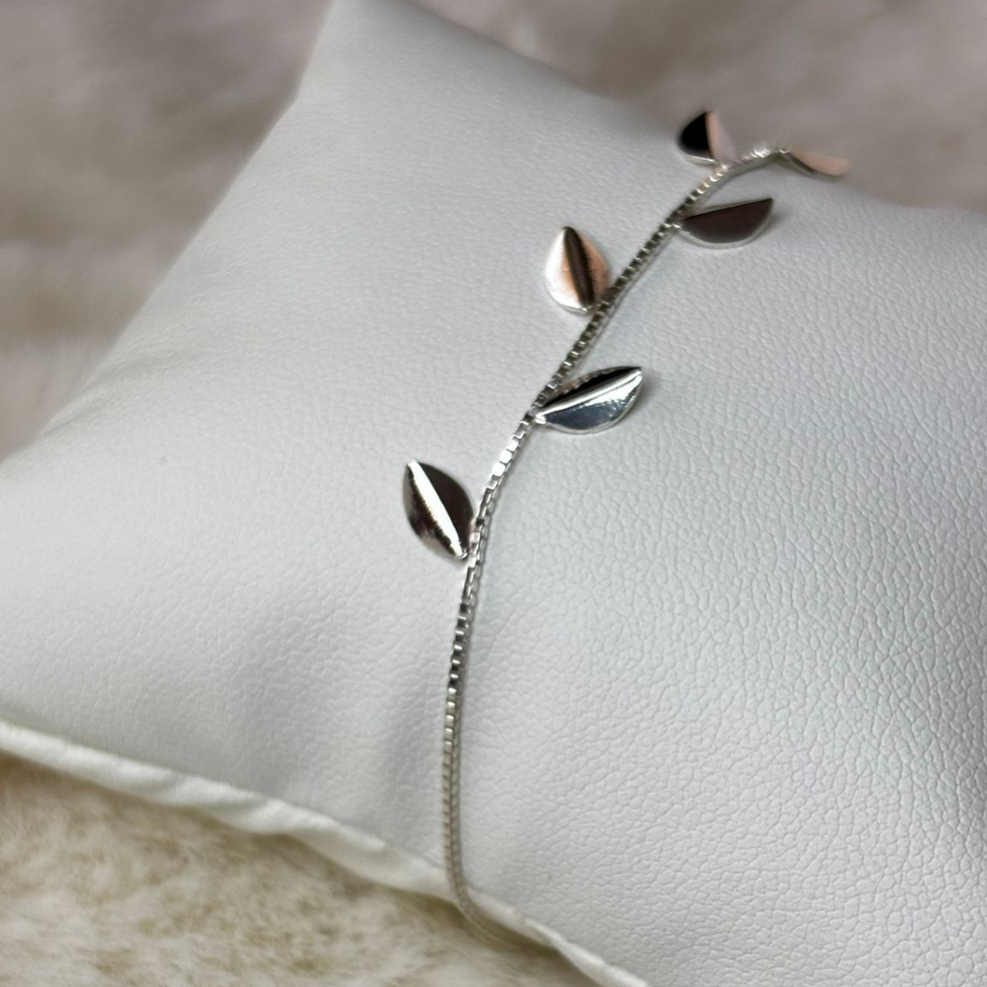 A Pulseira Caminho das Folhas captura a serenidade e a beleza orgânica da natureza em Prata 925 legítima. Sobre uma corrente veneziana cintilante, seis pequenas folhas delicadas estão dispostas harmoniosamente, criando um movimento suave e encantador no pulso.